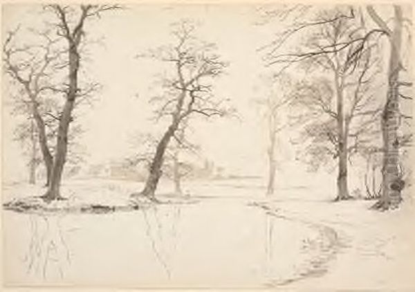 P.C. Skovgaard's Aaen gennem Breelde skov ved Usserød (The Stream Through Breelde Forest Near Usserød) is a quintessential example of Danish Golden Age painting, capturing the serene yet majestic beauty of Denmark's landscapes. Painted in 1843, this oil on canvas embodies Skovgaard's mastery of naturalistic detail and atmospheric depth, where dappled sunlight filters through dense foliage to illuminate a meandering forest stream. The composition balances intimate closeness with sweeping grandeur—moss-covered rocks and gnarled tree roots anchor the foreground, while the receding waterway draws the eye into the luminous distance. As a leading figure of Denmark's National Romantic movement, Skovgaard elevated landscape painting to poetic heights, rejecting idealized classical vistas in favor of local topography rendered with emotional authenticity. This work epitomizes his legacy as a bridge between Romanticism's reverence for nature and the emerging realism that would define Nordic art.