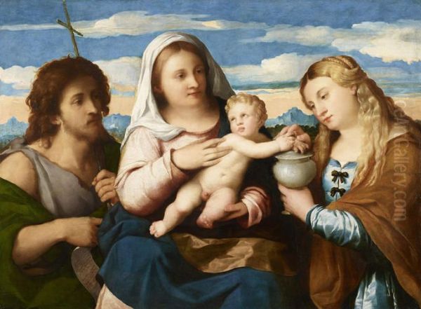 Palma Vecchio’s Madonna col Bambino tra i santi Giovanni Battista e Maria Maddalena (c. 1520), housed in the Accademia Carrara, Bergamo, is a luminous example of High Renaissance Venetian art. The painting exudes warmth and serenity, with the Virgin Mary tenderly cradling the Christ Child while flanked by St. John the Baptist and Mary Magdalene. The figures are bathed in soft, golden light, their richly textured drapery and naturalistic poses embodying Palma Vecchio’s mastery of color and composition. As a student of Giovanni Bellini and an influence on Titian, Palma bridged the transition from Bellini’s contemplative piety to Titian’s dynamic sensuality. This work showcases his signature traits—opulent pigments, balanced symmetry, and a harmonious blend of sacred and earthy beauty. It remains a vital piece in understanding Venetian Renaissance art, where devotion meets human elegance.