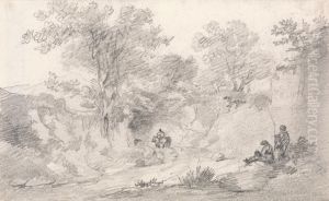 Patrick Nasmyth's Landscape With Figures Resting is a quintessential example of early 19th-century British landscape painting, blending Romantic sensitivity with topographic precision. The tranquil scene depicts weary travelers pausing under sprawling trees, their relaxed postures mirroring the gentle rhythm of the undulating countryside. Misty hills dissolve into a luminous sky—a signature Nasmyth effect achieved through delicate glazing—while meticulously rendered foliage demonstrates his academic training under his father, renowned architectural painter Alexander Nasmyth. As a key transitional figure between Enlightenment-era exactitude and the emotive spontaneity of Constable's generation, Nasmyth pioneered the "picturesque" aesthetic that would dominate Victorian decor. This particular work exemplifies his genius for harmonizing human presence with nature, transforming ordinary rural vignettes into contemplative idylls where time seems suspended beneath the play of light on winding paths and weathered tree trunks.