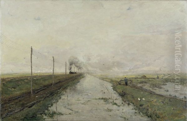 Paul Joseph Constantine Gabriel’s Landscape with a Train is a captivating example of 19th-century Dutch Romantic landscape painting. The work immerses viewers in a serene yet dynamic scene—a train cutting through a vast, sunlit countryside, surrounded by lush greenery and reflective waterways. Gabriel’s precise brushwork and keen attention to light evoke a harmonious balance between human progress and nature’s tranquility. Painted during the Hague School movement, the piece reflects the era’s fascination with atmospheric realism and the Dutch rural idyll. Though less renowned than his contemporaries like Jacob van Ruisdael, Gabriel’s landscapes are celebrated for their poetic simplicity and subtle emotional depth, bridging Romanticism and early Impressionism.