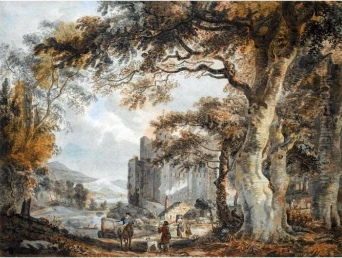 Paul Sandby’s A Capriccio Landscape With Figures Before A Castle is a captivating 18th-century watercolor that blends fantasy and realism with remarkable finesse. The painting transports viewers to an idyllic, romanticized scene—a picturesque castle perched atop rolling hills, framed by lush foliage and dotted with elegantly dressed figures in leisurely repose. Sandby, often hailed as the "father of English watercolor," mastered the delicate interplay of light and texture, infusing the work with a dreamlike yet meticulously detailed quality. As a pioneer of topographic and capriccio landscapes (imaginary compositions inspired by real elements), Sandby bridged the gap between documentary precision and artistic invention, influencing later Romantic painters like Turner. This piece exemplifies his skill in elevating watercolor from a mere sketching tool to a respected medium for finished works, securing his legacy in British art history.