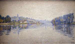 The luminous riverscape Bords de riviere, la Seine a Herblay (1901) embodies Paul Signac's mastery of Divisionism—the technique of applying pure pigment in distinct dots that optically blend in the viewer's eye. Bathed in Mediterranean-like brilliance despite depicting northern France, this work transforms the Seine's banks into a mosaic of shimmering azure, emerald, and golden hues, where flickering reflections dissolve solid forms into poetic vibrations of light. Signac, as Georges Seurat's chief disciple, elevated Pointillism toward decorative grandeur here; the rhythmic brushstrokes dance between meticulous structure and lyrical freedom. Less clinically scientific than Seurat yet more architectonic than later Furies, this transitional piece bridges 19th-century Neo-Impressionism and 20th-century color abstraction, influencing Matisse's early experiments. The diagonal sailboats and zigzagging shoreline create dynamic equilibrium, celebrating modernity's harmony with nature—a vision of optimistic工业化社会 seldom found in his contemporaries.