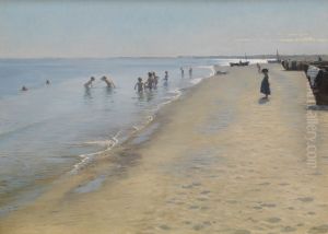 P. S. Kroyer: Naked Boy Running On The Beach Towards The Sea. "nogen Dreng, Set Fra Hojre Side I Lob Paa Sandet Ud Mod Vandet".
