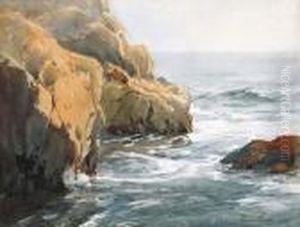 Rocky Cove by Percy Gray (1869–1952) is a luminous example of American Impressionism, capturing the rugged beauty of California’s coastal landscapes with poetic sensitivity. Painted in the early 20th century, the work embodies Gray’s signature ethereal style—soft, diffused light bathes the scene, where windswept cliffs meet the restless Pacific in a harmony of muted blues, greens, and earthy tones. Gray, influenced by Whistler and French plein air techniques, translated the transient effects of weather and atmosphere into delicate washes of watercolor or oil, earning him recognition as a bridge between tonalism and California Impressionism. Though less internationally celebrated than his East Coast peers, Gray’s works remain vital to understanding the regional evolution of Impressionism in the American West, where his meditative landscapes reflect both natural grandeur and intimate solitude.