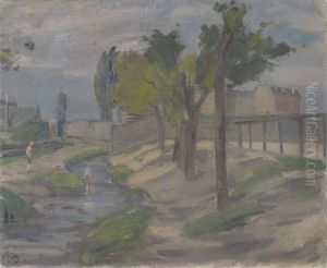 Drenge, der sopper i Ladegardsaen (?). I baggrunden husgavle