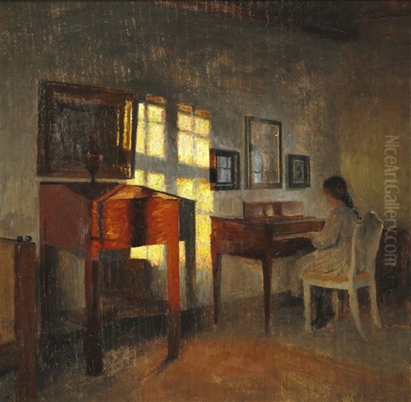 Peter Vilhelm Ilsted's Interior With Sunlight On The Wall And A Girl Playing The Piano is a masterful example of Danish interior painting from the late 19th to early 20th century, showcasing Ilsted's signature "sunlight interiors" that earned him international acclaim. The painting bathes in a serene, golden glow as sunlight streams through a window, casting delicate patterns on the wall and floor while illuminating a young girl absorbed in playing the piano. Ilsted, a key figure in Scandinavian Symbolism and Realism, excelled in capturing quiet domestic moments with extraordinary light sensitivity, often compared to his brother-in-law Vilhelm Hammershøi. This work epitomizes the intimisme tradition—intimate depictions of peaceful interiors—while demonstrating his virtuosic handling of reflected light and muted tonal harmonies. Historically, it represents the Danish "Golden Age" of painting's twilight, bridging photographic precision with introspective mood.