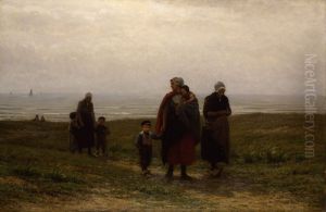 Philip Sadee's Op de duinen (On the Dunes) is a captivating 19th-century Dutch landscape painting that evokes the serene yet untamed beauty of coastal dunes. The artwork masterfully captures the interplay of light and shadow, with windswept grasses and undulating sand formations rendered in delicate brushstrokes. Sadee, a Hague School painter, was known for his atmospheric realism, and this piece exemplifies the movement’s focus on naturalism and mood. Painted during the 1870s–1890s, it reflects the Dutch reverence for their land while aligning with European plein air trends. Though less renowned than peers like Jacob Maris, Sadee’s dunescapes occupy a niche in Hague School historiography for their intimate, almost meditative quality. The subdued earthy palette—ochres, soft greens, and muted blues—creates a harmonious balance between detail and suggestion, making it a subtle yet poignant example of late-19th-century landscape painting.