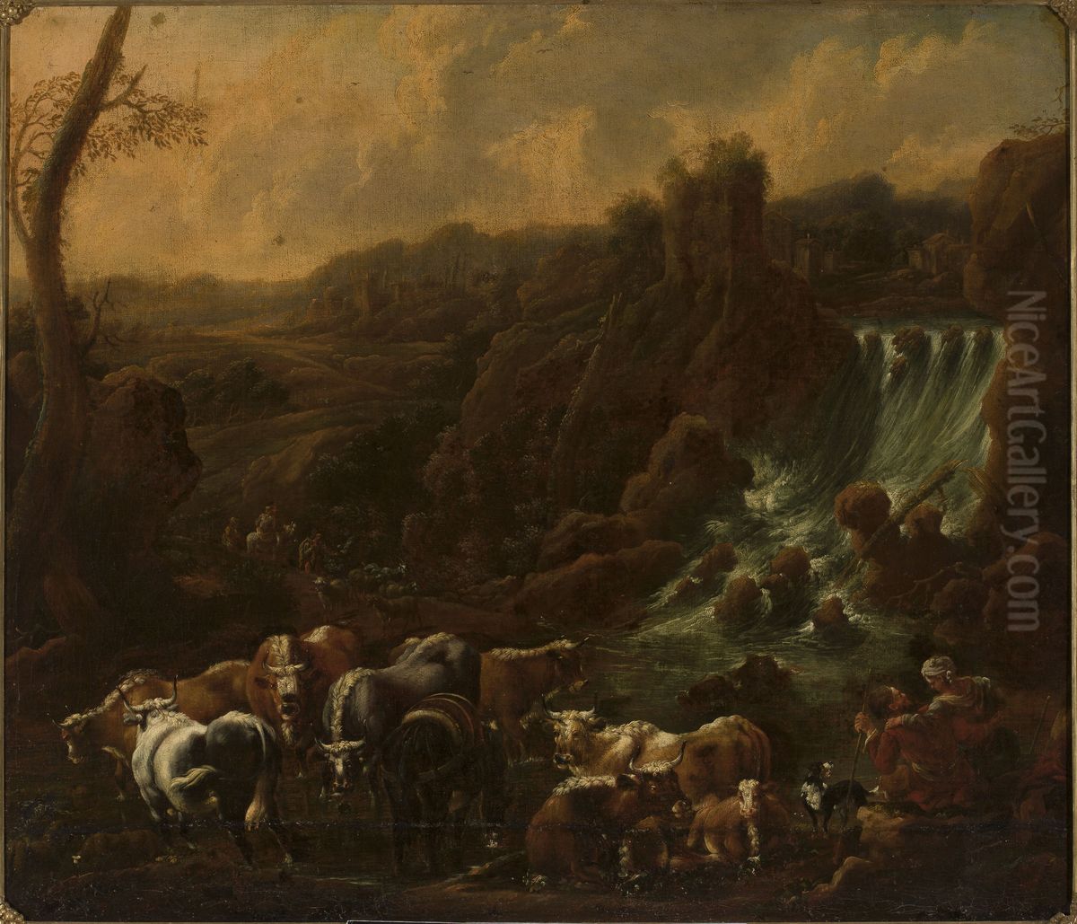 Philipp Peter Roos’ Cattle at the Waterfall is a vibrant pastoral scene that immerses viewers in the idyllic charm of 17th-century rural life. Known for his animal paintings, Roos—often called "Rosa da Tivoli"—captures a lively moment where cattle and figures gather near a cascading waterfall, enveloped in warm golden hues and soft natural light. His Baroque-influenced style blends realism with romanticism, emphasizing texture in the animals’ coats and the play of light on water and foliage. As part of the Dutch Italianates movement, Roos’ work reflects his time in Italy, merging Northern European detail with Southern luminosity. This painting exemplifies his mastery in animating landscapes with dynamic compositions, securing his place among prominent animaliers of his era. Its historical appeal lies in its harmonious balance of nature and livelihood, offering a nostalgic yet timeless aesthetic.