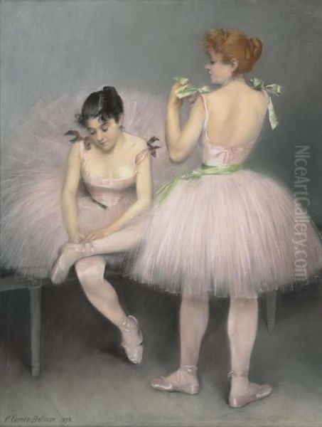 Pierre Carrier-Belleuse’s Les Danseuses captures the elegance and movement of ballet dancers with a luminous, almost ethereal quality. Painted during the Belle Époque, this work exemplifies Carrier-Belleuse’s mastery of Academic art blended with Impressionist touches—soft brushstrokes and delicate lighting that breathe life into the dancers' flowing skirts and poised gestures. Set against muted backgrounds, the figures radiate grace and dynamism, reflecting the era’s fascination with performance and femininity. Though less renowned than contemporaries like Degas, Carrier-Belleuse’s ballet scenes hold a unique charm, bridging 19th-century Academic precision and modern sensibilities. Les Danseuses embodies a moment where art and theatricality converged, offering viewers both technical refinement and emotive allure.