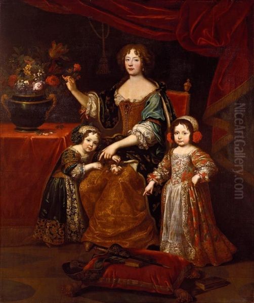 Pierre Mignard’s Elisabeth-Charlotte de Bavière, Duchesse d'Orléans, et ses enfants (c. 1675) is a masterful portrayal of courtly elegance and maternal tenderness. The painting depicts the Duchess—known as "Madame" at Louis XIV’s court—seated with her two young children in a sumptuous interior, bathed in soft, golden light. Mignard’s refined Baroque style shines through the intricate lace details, rich fabrics, and delicate rendering of faces, blending realism with aristocratic idealism. The composition’s intimacy contrasts with its formal grandeur, reflecting the dual role of Elisabeth-Charlotte as both a German-born noblewoman adapting to French court life and a devoted mother. As one of Mignard’s most celebrated portraits, the work exemplifies his skill in capturing personality through subtle expressions while adhering to the decorum of royal portraiture. Its historical significance lies in its depiction of the Orléans lineage and the cultural fusion of the late 17th century, making it a cornerstone of French Baroque art.
