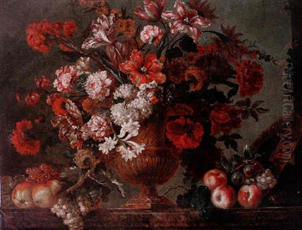 A Still Life Of Flowers In An Urn With Fruit Resting On A Marble Ledge