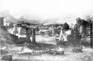 Ein Sudlicher Hafen Mit Einem Antiken Monument, Schiffen Und Vielen Figuren