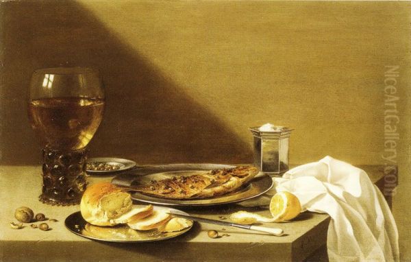 Pieter Claesz's Still Life with Walnut, Bread, and Herring with Silver Salt Cellar and Glass of Wine (c. 1635) exemplifies the Dutch Golden Age's mastery of vanitas painting—an artistic meditation on life’s transience. Bathed in subdued golden light, the composition humbly presents a pewter plate holding half-peeled walnut shells, a crusty bread roll, and a herring draped over its edge, accompanied by an ornate salt cellar and a wineglass tipped precariously. Claesz’s virtuosic handling of textures—translucent fish scales, reflective pewter, crumbling bread—invites tactile contemplation, while the tipped glass and fractured walnut shells whisper symbolic reminders of mortality. This work marked a shift toward monochromatic "breakfast pieces" (ontbijtjes), where restraint in color (ochres, browns, grays) heightened realism and emotional depth. Claesz, alongside Willem Claesz Heda, pioneered this intimate still-life genre, elevating everyday objects into profound meditations—earning his place as a cornerstone of 17th-century Dutch realism.