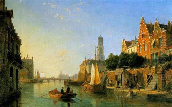 Pieter Cornelis Dommershuijzen’s A River View, Utrecht is a serene yet evocative 19th-century Dutch landscape painting that captures the tranquil beauty of Utrecht’s waterways. The scene unfolds under a softly lit sky, where sunlight dances on the river’s surface, reflecting the charming architecture and boats along its banks. Dommershuijzen, a lesser-known but skilled practitioner of the Hague School, imbues the work with a meticulous realism reminiscent of the Dutch Golden Age, while embracing the loose brushwork and atmospheric focus characteristic of his era. This painting is a quiet testament to the Netherlands’ enduring tradition of river landscapes, bridging Romanticism’s poetic sensibility with a proto-Impressionist attention to light and everyday life. Though not as widely celebrated as works by Jongkind or Maris, it exemplifies the understated elegance of 19th-century Dutch realism.