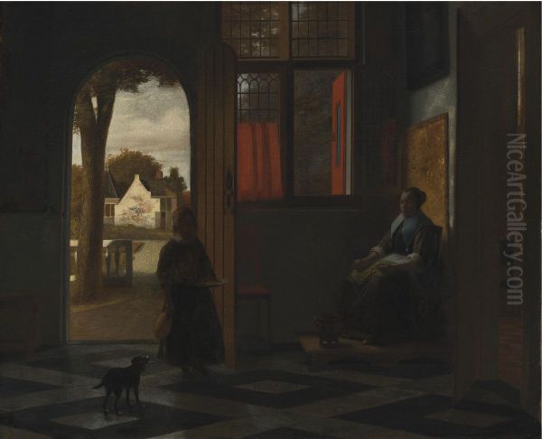 Pieter de Hooch's A Woman Seated at a Window and a Child in a Doorway (c. 1658) captures a serene yet intimate Dutch domestic scene bathed in golden light. The painting epitomizes De Hooch’s mastery of perspective and light—hallmarks of the Dutch Golden Age—as sunlight streams through an open door, illuminating the quiet interaction between a woman absorbed in sewing and a curious child peering outdoors. The meticulously tiled floor and architectural details reflect De Hooch’s fascination with spatial depth, while the restrained palette of warm ochres and soft whites exudes calm. Historically, this work exemplifies the genre of "genre painting," where everyday moments were elevated to art, showcasing Protestant Holland’s values of domesticity and virtue. De Hooch’s ability to harmonize geometry with humanity places him alongside Vermeer as a pioneer of interior scenes, making this piece a gem of 17th-century realism.