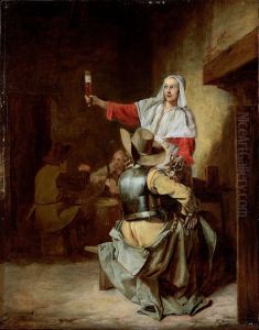 Pieter de Hooch’s Licensing exudes a quiet yet profound charm, capturing the warmth of domestic life through his masterful use of light and perspective. Painted during the Dutch Golden Age, the artwork exemplifies De Hooch’s signature style—intimate interior scenes bathed in soft, diffused sunlight, often with doorways or courtyards framing distant spaces. Known for his meticulous attention to detail and harmonious compositions, De Hooch’s work reflects the societal shift toward valuing private, middle-class life in 17th-century Netherlands. Licensing stands out for its serene atmosphere and subtle narrative, inviting viewers to ponder the quiet moments of everyday existence. Alongside Vermeer, De Hooch pioneered genre painting, elevating mundane scenes into poetic reflections on human connection and spatial beauty, making this piece a treasured artifact of art history.