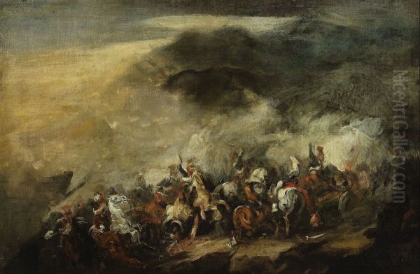 Piotr Michałowski’s Battle of Somosierra is a dramatic and emotionally charged depiction of the 1808 battle during the Napoleonic Wars, where Polish cavalry played a pivotal role. Known for his dynamic, almost Romantic style, Michałowski captures the chaos and heroism of the moment with bold, sweeping brushstrokes and a vivid interplay of light and shadow. The painting exudes a sense of movement and urgency, with charging horses and soldiers rendered in an expressive, almost unfinished manner—a hallmark of Michałowski’s energetic approach. Historically significant, the work reflects Poland’s martial pride under foreign partitions, blending realism with an emotional intensity that places Michałowski among the leading Romantic painters of Eastern Europe. The Battle of Somosierra remains one of his most celebrated works, embodying both nationalistic fervor and artistic innovation.