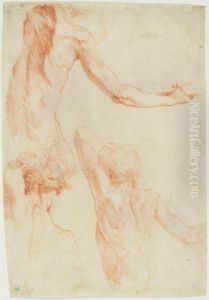 A couple of soldiers dragging of a prisoner (left) and a nude man striking out (right)