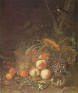 A Forest Floor Still Life With Horse Chestnuts, Peaches, Grapes, Abird's Nest And A Lizard