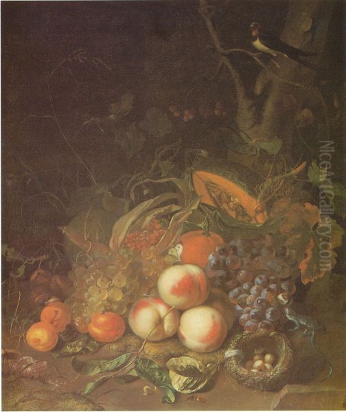 Fruit still life with a bird's nest and lizard