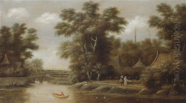 A Wooded River Landscape With An Elegant Couple Conversing And A Man In A Rowing Boat At The Edge Of A Village