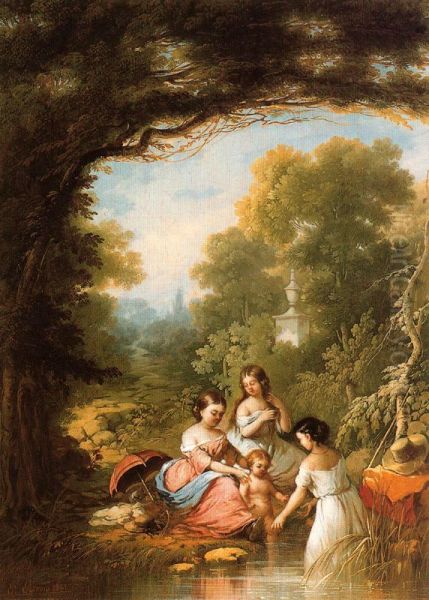 Ninas banandose by Rafael Romero Barros envelops viewers in an intimate moment of everyday life, masterfully capturing the innocence and delicate interaction between two young girls bathing. Created in the 19th century, this exquisite oil painting reflects Barros’s meticulous realism and his profound observation of Andalusian domestic scenes. Bathed in soft, natural light, the warm tones of their skin contrast subtly with cooler background hues, showcasing Barros's academic training and nuanced color palette—a hallmark of Spanish realist tradition. Though lesser-known internationally than contemporaries like Sorolla, Barros remains pivotal in regional Spanish art history for documenting vernacular life with both tenderness and precision. The painting’s quiet narrative invites contemplation, bridging Romanticism’s emotive depth with emerging realist trends.