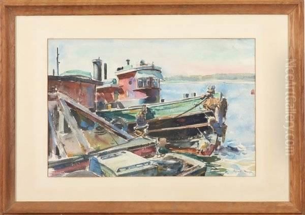 Reginald Marsh's Water Scene With Tugboat captures the raw energy of New York's bustling waterfront in the mid-20th century. Painted in Marsh's signature Social Realist style, the work brims with dynamism—choppy waters churn around a sturdy tugboat, its thick smoke merging with stormy skies, while dockworkers and vessels hint at the industrial era's grit. Marsh, known for documenting urban life with unflinching honesty, here elevates a mundane industrial scene into a symphony of motion and texture. His loose, vigorous brushwork and earthy palette reflect Ashcan School influences, yet his focus on laborers and machinery aligns with Depression-era narratives. Though less celebrated than his subway scenes or burlesque works, this painting exemplifies Marsh's mastery in portraying American urban vitality, securing his place as a pivotal chronicler of 20th-century cityscapes.