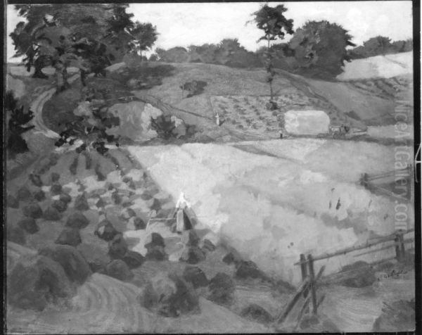 For interior decoration, this lyrical landscape would excel in spaces designed for contemplation - perhaps a library corner or executive office where its pastoral calm could counterbalance modern stresses. The painting's earthy ochres and twilight blues would complement neutral palettes featuring warm taupes or cool greys, while its horizontal format suggests placement above a console table or behind a sofa. In contemporary settings, frame it with a slender gilt or oak floater frame to preserve its vintage charm. At approximately 24x36 inches (typical for Eichler's smaller works), it would create an intimate focal point without overwhelming medium-sized rooms. For harmonious styling, pair with rustic-modern elements like linen textiles,锤击金属 accents, and organic pottery to echo its agricultural theme while maintaining sophistication.