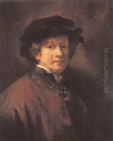Rembrandt's Self-Portrait with Black Beret and Golden Chain (c. 1633) is a mesmerizing glimpse into the artist's early mastery. Painted at age 27 during his Leiden period, the work radiates quiet confidence through its dramatic chiaroscuro—a hallmark of Baroque style. The soft black beret frames Rembrandt's face, drawing attention to his thoughtful gaze, while the golden chain (a symbol of artistic prestige) glows against the warm, earthy tones of his cloak. The delicate play of light on his ruddy cheeks and the subtle texture of his stubble showcase his revolutionary approach to realism. This self-portrait marked a pivotal moment when Rembrandt transitioned from local success to international recognition, foreshadowing his later psychological depth. Today, it stands as a testament to his enduring influence on portrait painting, bridging Renaissance precision with the emotional intimacy that would define Dutch Golden Age art.