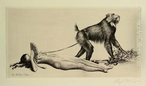 "liegender Weiblicher Akt Mit Facher, Einen Affen Mit