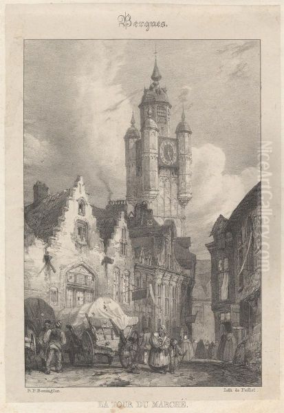 Richard Parkes Bonington's Bergues - La Tour du Marche is a luminous example of early 19th-century Romantic landscape painting, capturing the quiet charm of the Flemish town of Bergues with remarkable delicacy. The painting depicts the medieval market tower bathed in soft, atmospheric light, its reflection shimmering in the tranquil waters of the canal below. Bonington's loose, fluid brushwork and keen sensitivity to light and atmosphere reveal the influence of both English watercolor traditions and French plein-air painting. Completed around 1824 during his travels in northern France, the work exemplifies Bonington's ability to blend topographical precision with poetic lyricism—a hallmark that earned him admiration from contemporaries like Eugène Delacroix. Though his career was tragically cut short, Bonington’s works bridged the gap between Constable’s naturalism and the emerging Impressionist movement, securing his legacy as a pivotal figure in European landscape painting.