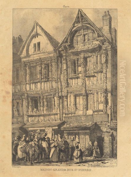 Richard Parkes Bonington's Caen - Maison Grande Rue Saint-Pierre is a captivating jewel of early 19th-century Romanticism, capturing the quiet charm of Normandy’s architecture with luminous delicacy. Painted circa 1823–24, this watercolor and gouache piece showcases Bonington’s masterful handling of light and atmosphere, where soft washes of ochre and gray evoke the weathered texture of the half-timbered house, while deft touches of white suggest sunlight glinting off aged stone. A pioneer of the English watercolor tradition and influential among French Romantics like Delacroix, Bonington’s work bridges documentary precision and poetic lyricism—this piece epitomizes his ability to transform mundane streetscapes into vignettes of timeless elegance. Though his career was tragically brief, Bonington’s innovative techniques and continental subjects left an indelible mark on both British and French art, making this painting a treasured example of trans-Channel artistic exchange.