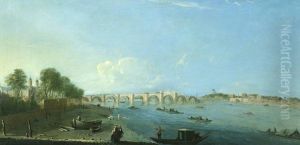 Figures Resting On A River Bank, A Village Beyond In A William Kent Style Frame