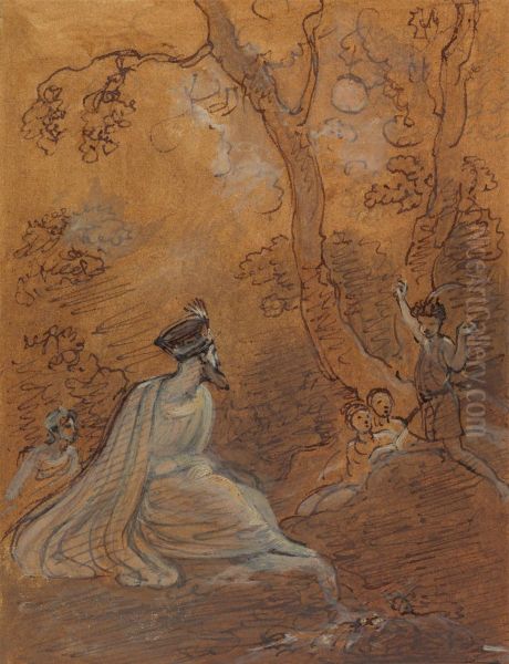 The painting Oberon and Puck by Robert Smirke captures a magical moment from Shakespeare’s A Midsummer Night’s Dream, exuding an ethereal and whimsical charm. Smirke, a prominent 19th-century British painter, masterfully blends Romanticism with neoclassical precision, creating a dreamlike scene where the fairy king Oberon and the mischievous Puck are bathed in soft moonlight, surrounded by lush foliage. The delicate brushwork and luminous tones evoke a sense of enchantment, while the figures' expressive gestures bring the Shakespearean drama to life. As a key figure in the Romantic movement, Smirke’s work reflects the era’s fascination with literature, nature, and the supernatural. This piece stands as a fine example of 19th-century narrative painting, bridging the gap between theatrical storytelling and fine art.