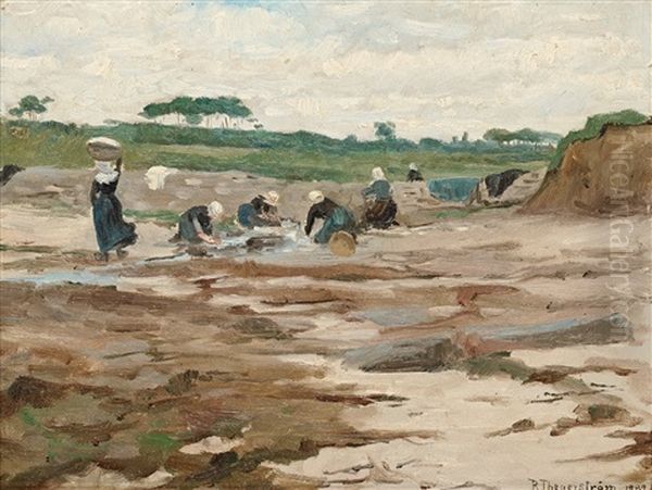Robert Thegerstroem’s Lavandieres (also known as The Washerwomen) is a luminous example of late 19th-century European painting, infused with the delicate brushwork and atmospheric light characteristic of plein air influences. The scene depicts washerwomen working by a sun-dappled riverbank, their figures rendered with soft, impressionistic touches that blur the boundary between realism and poetic idealism. Thegerstroem, a Swedish artist active in France, bridged academic tradition and emerging modernism, with this piece reflecting both naturalistic observation and a subtle symbolic undertone. Though not as widely recognized as his contemporaries, Thegerstroem’s work occupies a quiet but significant niche in Scandinavian art history, offering a glimpse into the everyday grace of rural life before industrialization. The painting’s muted yet radiant palette—think pale blues, earthy ochres, and watery greens—creates a serene, almost meditative quality.