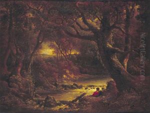A Wooded River Lanscape With Stags Chased By Huntsmen And Their Dogs
