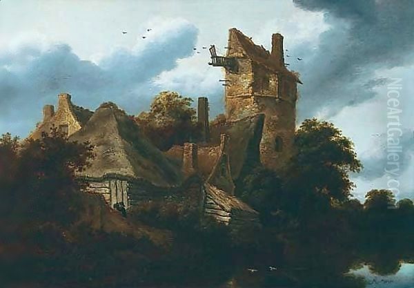 A River Landscape With Hunters And Fishermen Near Rustic Buildings