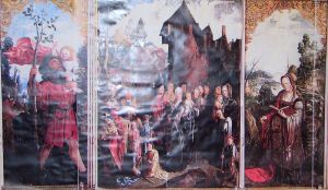 For a sophisticated yet warm interior, this painting thrives in spaces blending classical and organic elements. Hang it above a walnut-toned console in a study or dining room alongside Biedermeier furniture to echo its historical roots; the gilded accents pair beautifully with brass lamp bases or picture frames. Select a frame with delicate Baroque-inspired carvings—preferably in warm gold—to mirror the altarpiece’s ornate details. Given its likely intimate scale (typical of von Alt’s watercolors), position it where natural light simulates the painting’s luminous glow, perhaps opposite a window or beneath directional lighting. Balance its crimson and gold tones with muted sage green or taupe walls, allowing the artwork to anchor the room’s palette. In offices, it lends gravitas to executive areas, harmonizing with leather-bound books and dark wood furnishings for a timeless, cultured ambiance.