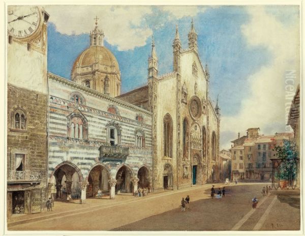 Rudolf von Alt’s Der Domplatz von Como (1854) captures the sun-drenched charm of Como’s historic cathedral square with remarkable vivacity. The Austrian master, renowned for his topographical precision and luminous watercolor technique, bathes the scene in warm golden hues, contrasting the ornate Renaissance facade of the cathedral with bustling figures and shadow-dappled arcades. Painted during his Italian travels, the work exemplifies Biedermeier realism blended with a Romantic sensitivity to light and atmosphere—a bridge between documentary precision and poetic mood. Von Alt’s nuanced play of reflections on wet cobblestones and his delicate rendering of architectural details place this among his finest urban landscapes, reflecting 19th-century Europe’s fascination with Italy as both cultural pilgrimage site and aesthetic ideal. Its historical significance lies in its role as a precursor to Impressionism’s plein-air spontaneity, while retaining Old Masterly compositional rigor.