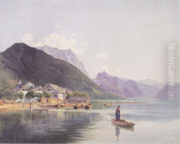 Rudolf von Alt's Der Traunsee (1855) is a luminous masterpiece of Austrian Biedermeier realism, capturing the serene beauty of Lake Traunsee framed by majestic Alpine peaks. With meticulous detail and a poetic sensitivity to light, Alt renders the glassy water surface reflecting the golden sunrise, while delicate brushstrokes animate the foliage and distant villages. As a leading watercolorist of his era, Alt pioneered plein air painting techniques that influenced later Impressionists—his topographic precision coexists with an almost Romantic atmosphere. This work epitomizes 19th-century bourgeois appreciation for nature’s idyllic harmony, while its compositional balance between foreground detail and vast spatial depth reflects Alt’s mastery in merging scientific observation with aesthetic lyricism. Today, it’s celebrated as a cornerstone of Central European landscape painting, housed permanently in Vienna’s Albertina Museum.