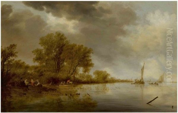 The painting River Landscape with Fishermen Tending Their Nets Along a Bank by Salomon van Ruysdael is a quintessential example of Dutch Golden Age landscape painting. Created in the mid-17th century, it captures a serene yet lively riverside scene where fishermen go about their daily tasks under a vast, cloud-filled sky. Van Ruysdael's masterful use of light and atmosphere infuses the work with a sense of tranquility and harmony with nature, characteristic of the Dutch realist tradition. The composition balances human activity—the fishermen and their boats—with the quiet grandeur of the river and surrounding countryside, reflecting the era's fascination with land and water as both livelihood and artistic subject. As a leading figure of the Haarlem school, Van Ruysdael's works, including this one, played a pivotal role in elevating landscape painting to an independent genre, moving beyond mere background settings to become evocative, stand-alone narratives.