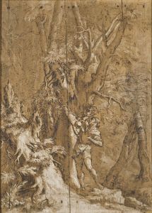 Three Men In A Landscape Pen And Brown Ink, Brown Wash 1¾ X 4¼ In