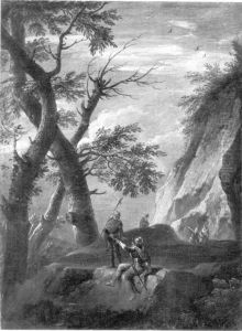 Gebirgslandschaft mit drei Kriegern auf einem Felsen im Vordergrund