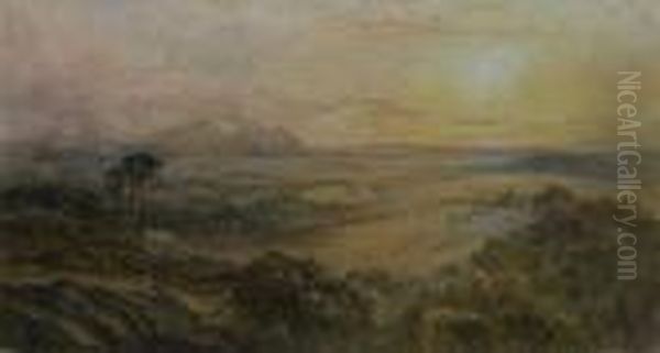 Samuel Bough’s Sunset Looking Towards Edinburgh From The North West (c. 1850s) is a masterful example of Romantic landscape painting, capturing the dramatic interplay of light and atmosphere over Edinburgh’s iconic skyline. Bathed in the fiery hues of a setting sun, the painting juxtaposes the rugged natural beauty of the foreground with the distant silhouette of the city, evoking a sense of grandeur and tranquillity. Bough, a prominent Scottish artist of the 19th century, was influenced by the traditions of J.M.W. Turner and the Scottish Enlightenment, blending meticulous topographical detail with emotive, almost theatrical lighting. This work exemplifies his skill in balancing realism with poetic license, securing his reputation as one of Scotland’s foremost landscape painters. Today, it holds historical significance as a visual record of Edinburgh’s evolving relationship with its natural surroundings during the Industrial Revolution, while its evocative style bridges the gap between Romanticism and early Impressionism.