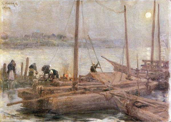 Under the mystic glow of a crescent moon, Boats Mooring under the Moon by Shigeru Aoki envelops the viewer in a serene yet haunting maritime nocturne. The Japanese artist, active during the Meiji and Taishō periods, masterfully blends Western Romanticism with traditional Japanese aesthetics—evident in the painting’s dramatic chiaroscuro and delicate brushwork. The scene depicts weathered fishing boats tethered to a shadowy shore, their silhouettes trembling under the moon’s silver light, while the inky waters reflect an ethereal shimmer. Aoki, a pioneer of yōga (Western-style painting) in Japan, infused his works with symbolic depth, often drawing from mythology and nature. This piece exemplifies his transitional role in Japanese art history, bridging Edo-era subtlety and modernist experimentation. Its atmospheric tension and dreamlike quality align with the fin-de-siècle Symbolist movement, yet it remains distinctly rooted in Japan’s coastal vernacular, making it a rare gem in early 20th-century East Asian art.