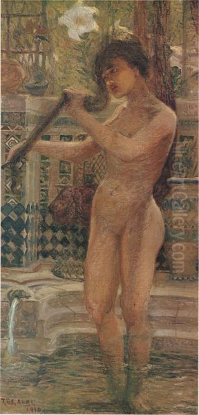 Hot Spring by Shigeru Aoki (1905) immerses viewers in a dreamlike, mystical world where nature and human existence harmoniously intertwine. The painting depicts a group of nude figures bathing in a secluded hot spring, enveloped by lush foliage and ethereal light. Aoki, a pioneering Japanese Western-style painter, blends Symbolist influences with Japanese aesthetic sensibilities, creating a work that feels both timeless and otherworldly. The soft, diffused glow and delicate brushwork evoke a sense of tranquility, while the composition—with its flowing curves and organic forms—reflects Aoki’s fascination with spirituality and nature. Historically significant, this piece marks a bridge between late 19th-century European Romanticism and Japan’s Meiji-era art movement, showcasing Aoki’s unique role in adapting Western techniques to Japanese themes.