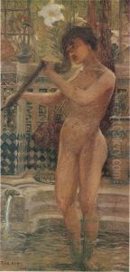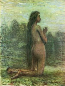 In Shigeru Aoki’s Woman With Camellias, a dreamlike melancholy permeates the canvas, where soft floral hues caress the contemplative figure of a woman holding crimson camellias—a traditional Japanese symbol of transient beauty. Painted circa 1920 during Japan’s Taishō Romantic era, Aoki blends Western Impressionism’s loose brushwork with nihonga (traditional Japanese painting) symbolism, creating a poetic bridge between East and West. The artwork reflects Aoki’s fascination with European Pre-Raphaelite mysticism, yet retains Japonism’s delicate naturalism. As a pioneer of Japanese modernism, Aoki’s works like this one are celebrated for their emotive storytelling and hybrid techniques, offering a rare glimpse into the cultural crosscurrents of early 20th-century Japan.