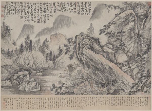 Shitao Daoji’s Yuan Ji Shan Shui Heng Zhou (《原济山水横轴》) is a mesmerizing example of Qing Dynasty literati painting, embodying the artist’s signature blend of spontaneity and emotional depth. The scroll unfurls a dreamlike landscape where jagged cliffs, mist-laden valleys, and flowing rivers merge in rhythmic brushwork, capturing Daoji’s philosophy of "One Line" (一画) — the belief in art as an extension of the soul’s unrestrained expression. Unlike his more orthodox contemporaries, Shitao’s style is dynamic yet poetic, with ink washes that suggest rather than define, leaving room for the viewer’s imagination. As a monk-painter of the early Qing era, his work bridges the tradition of Song-Yuan literati painting and the individualism of later masters like Bada Shanren. This piece, likely created during his travels in southern China, reflects his rejection of rigid techniques in favor of intuitive, almost calligraphic strokes. Today, it stands as a pivotal work in Chinese art history, exemplifying how Ming-Qing transitional artists redefined landscape painting as a medium for personal contemplation.