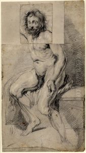 A nude male with wavy hair and a beard