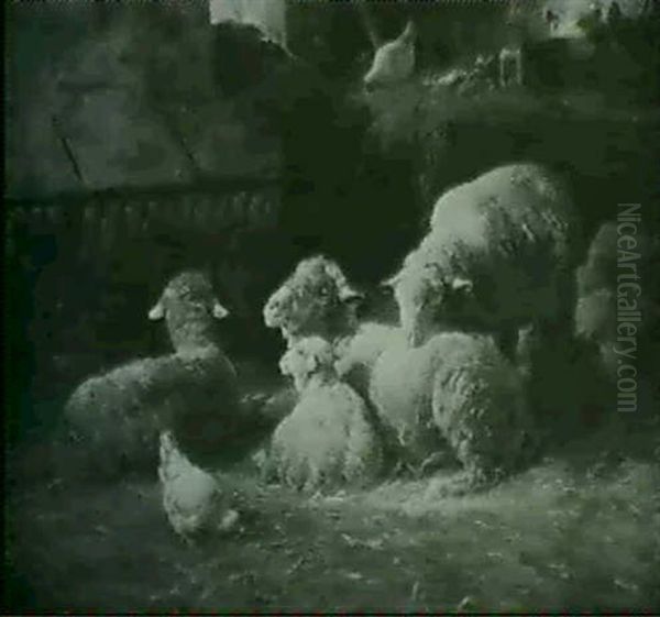 Stallinterieur Mit Ruhenden Schafen Und Huhnern